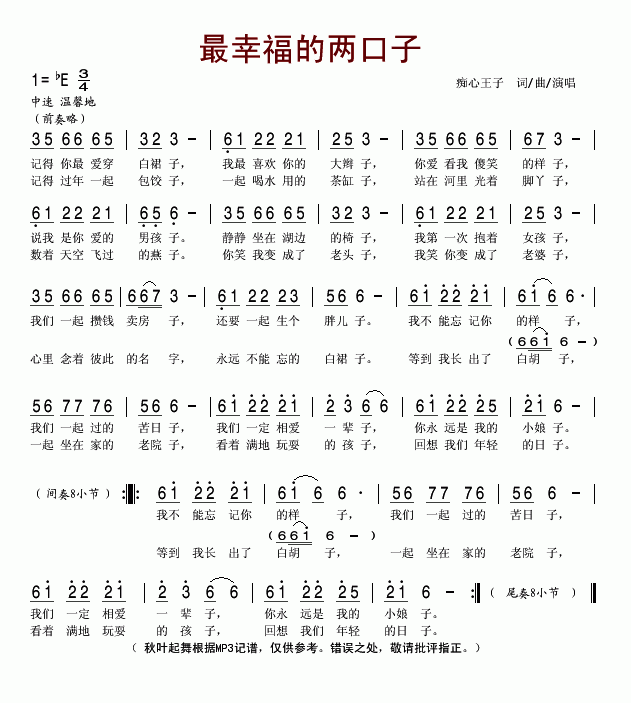 词曲/演唱:痴心王子最幸福的两口子歌词: