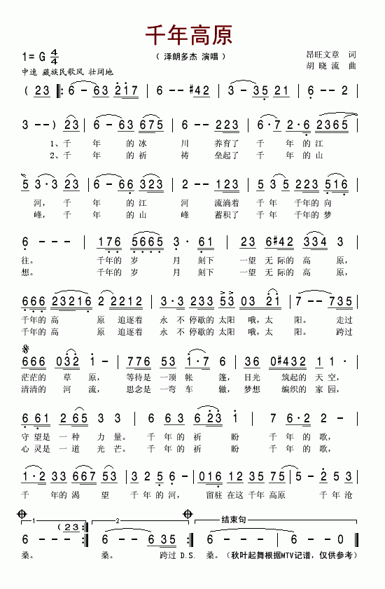 >> 千年高原-泽朗多杰(简谱)
