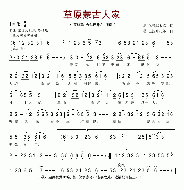 >> 草原蒙古人家-英格玛 布仁巴雅尔(简谱)