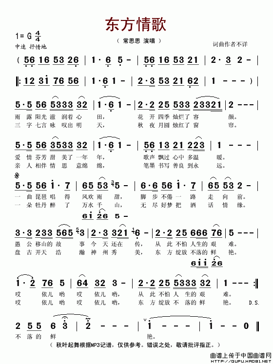 >> 东方情歌-常思思(简谱)