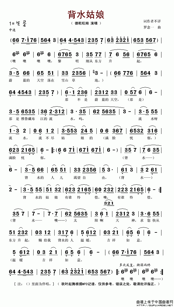 >> 背水的姑娘-德乾旺姆(简谱)