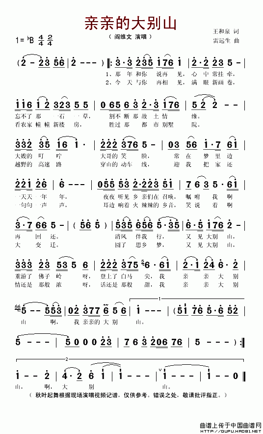 >> 亲亲的大别山-阎维文(简谱)