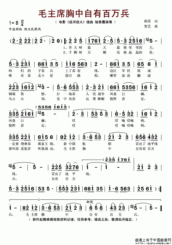 >> 毛主席胸中自有百万兵-陆青霜(简谱)