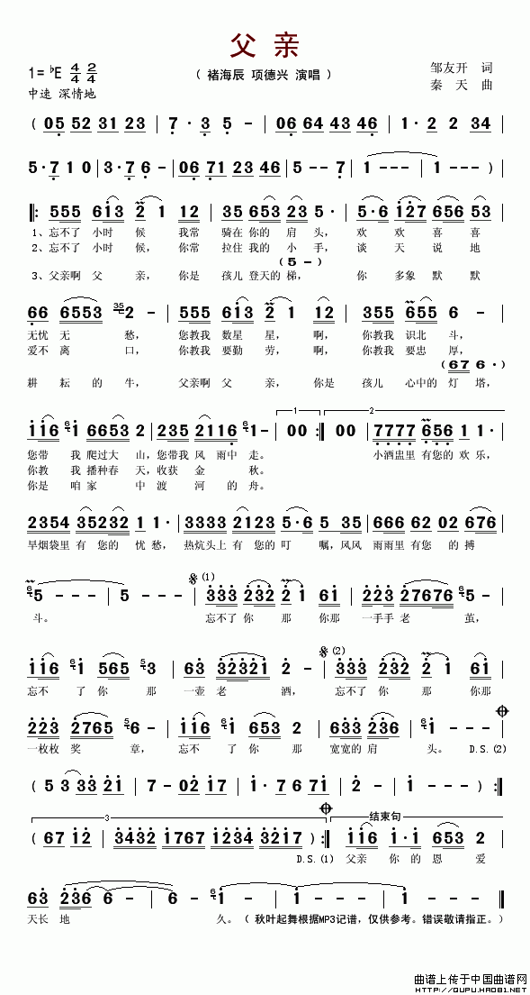 (合)父亲啊父亲你是孩儿登天的梯,你多象默默耕耘的牛,父亲啊父亲你是孩儿心中的灯塔,你是咱家中渡河的舟,忘不你那你那一手手老茧,忘不了你那一壶老酒,忘不了你那你那一枚枚奖章,忘不了你那宽宽的肩,忘不了你那你那一手手老茧,忘不了你那宽宽的肩头,父亲你的恩爱天长地久。