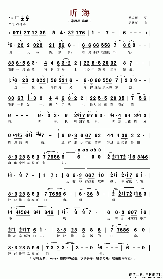 >> 听海-常思思(简谱)