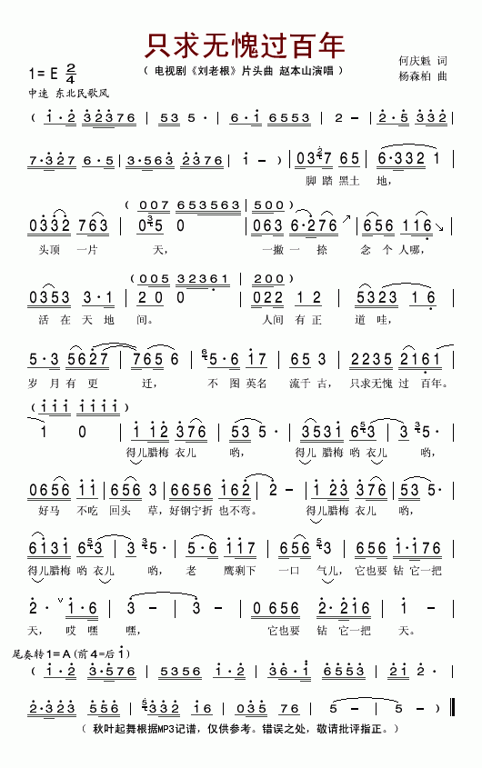赵本山《只求无愧过百年》歌词: