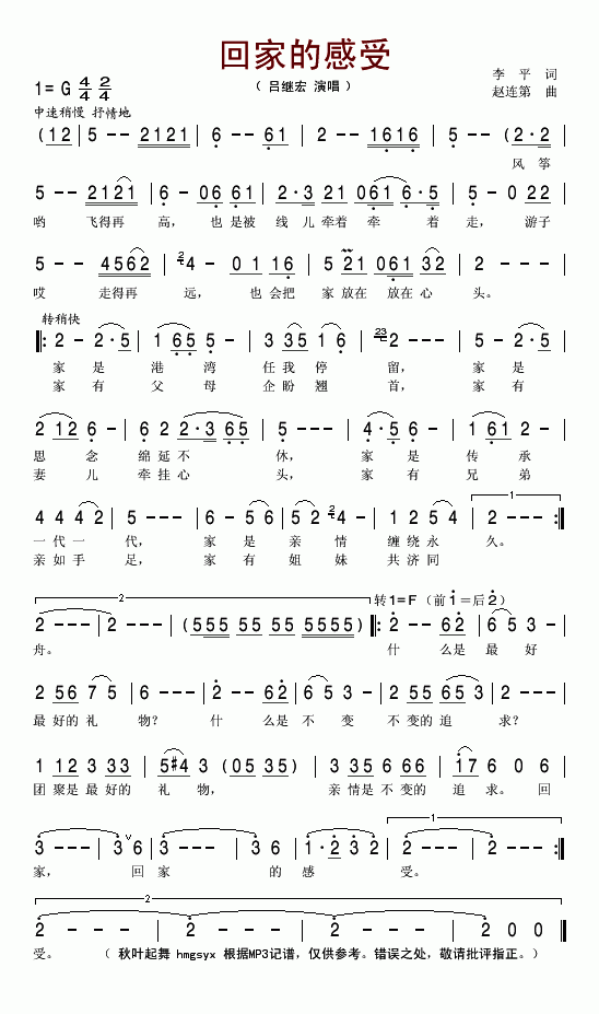 >> 回家的感受-吕继宏(简谱)