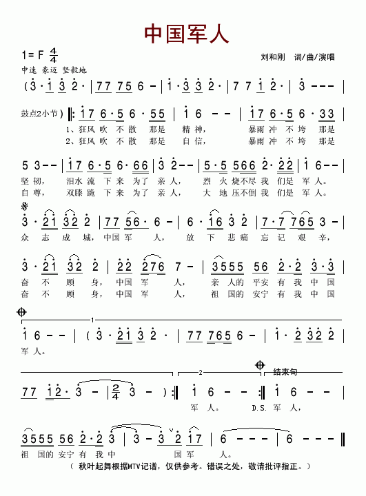 >> 中国军人-刘和刚(简谱)