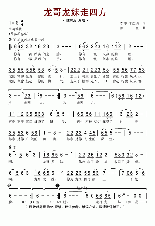 龙哥龙妹走四方-陈思思(简谱)