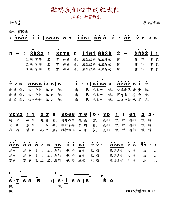 >> 歌唱我们心中的红太阳-新苫的房(简谱)
