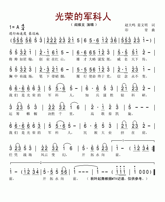 >> 光荣的军科人-阎维文(简谱)