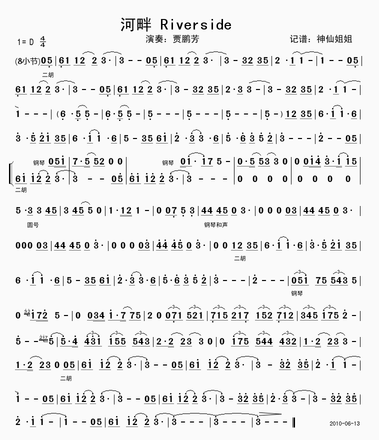 >> 河畔 River side-贾鹏芳(二胡曲谱)