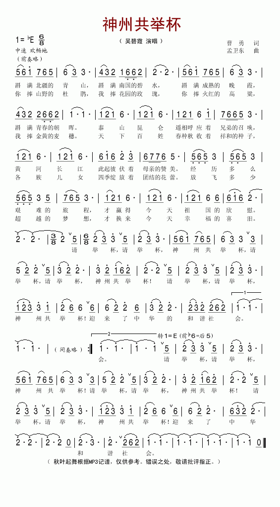 >> 神州共举杯-吴碧霞(简谱)