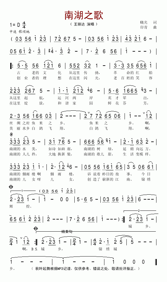 >> 南湖之歌-王丽达(简谱)