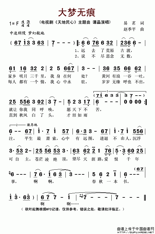 >> 大梦无痕-谭晶(电视剧《田地民心》主题曲)
