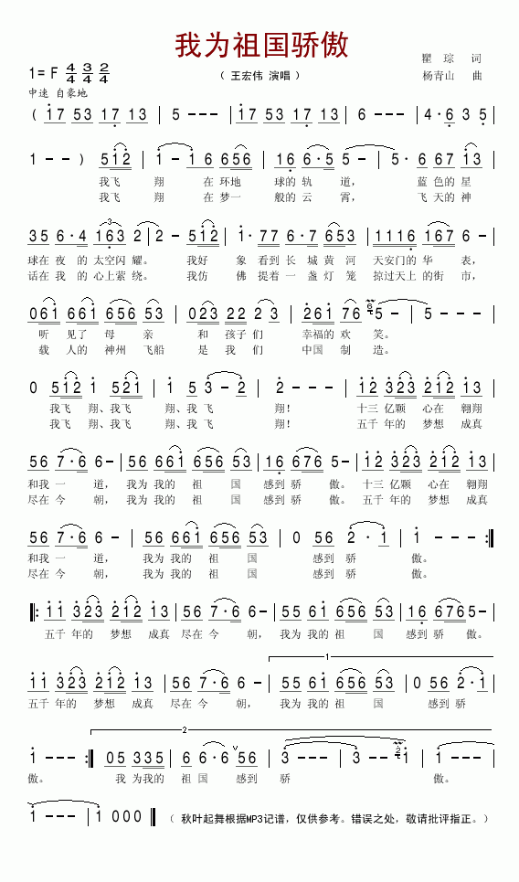 >> 我为祖国骄傲-王宏伟(简谱)