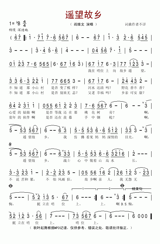 遥望故乡-阎维文(简谱)
