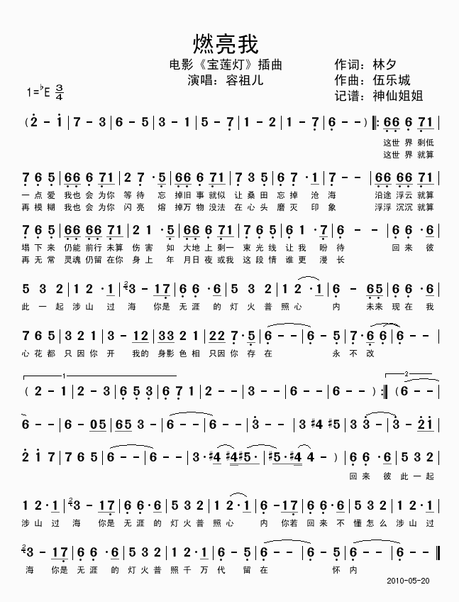 >> 燃亮我-容祖儿(电影《宝莲灯》插曲简谱)