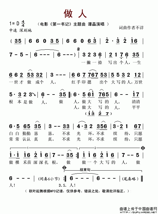 >> 做人-谭晶(电影《第一书记》的主题曲简谱)