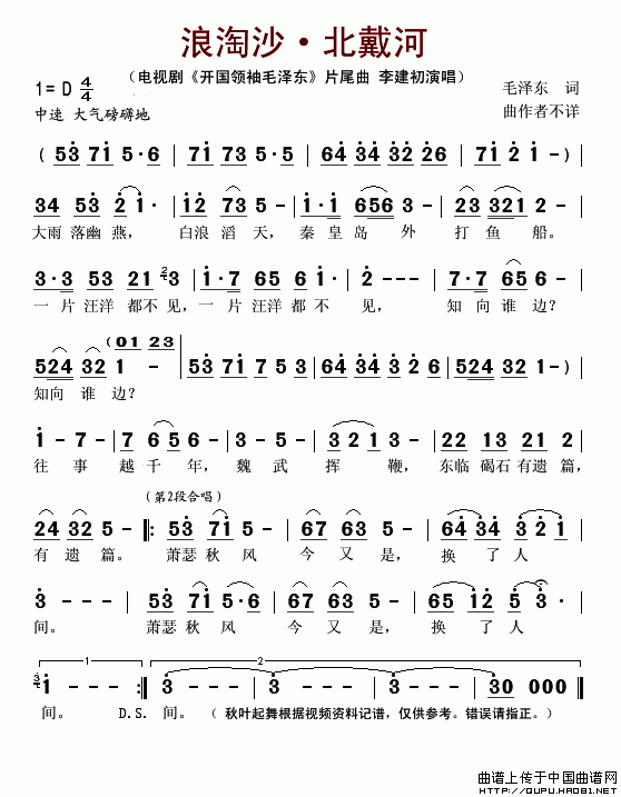 >> 浪淘沙·北戴河-李建初(电视剧《开国领袖毛泽东》片尾曲简谱)