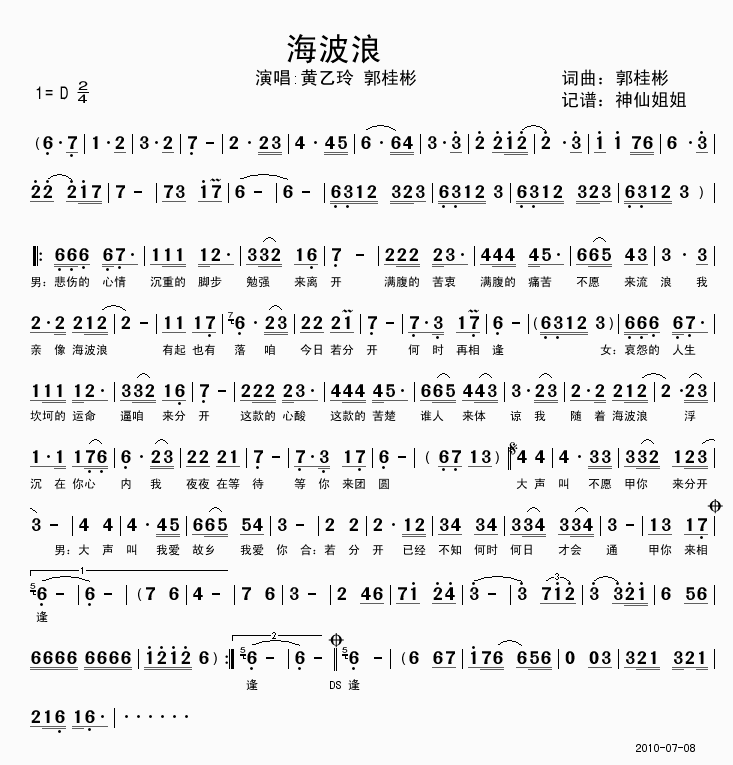 >> 海波浪-黄乙玲 郭桂彬(简谱)
