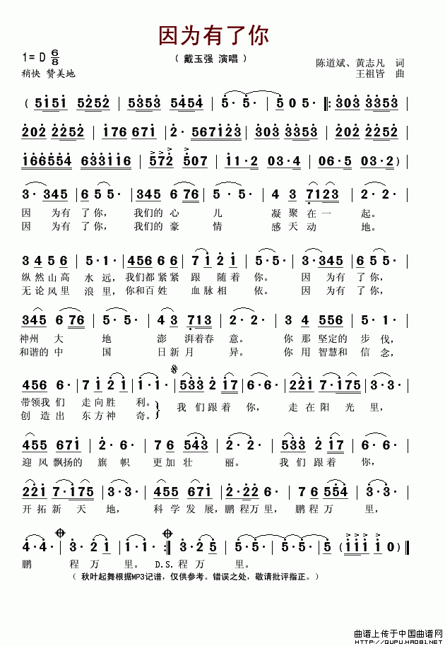>> 因为有了你-戴玉强(简谱)