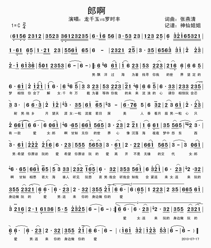 >> 郎啊-龙千玉 罗时丰(简谱)