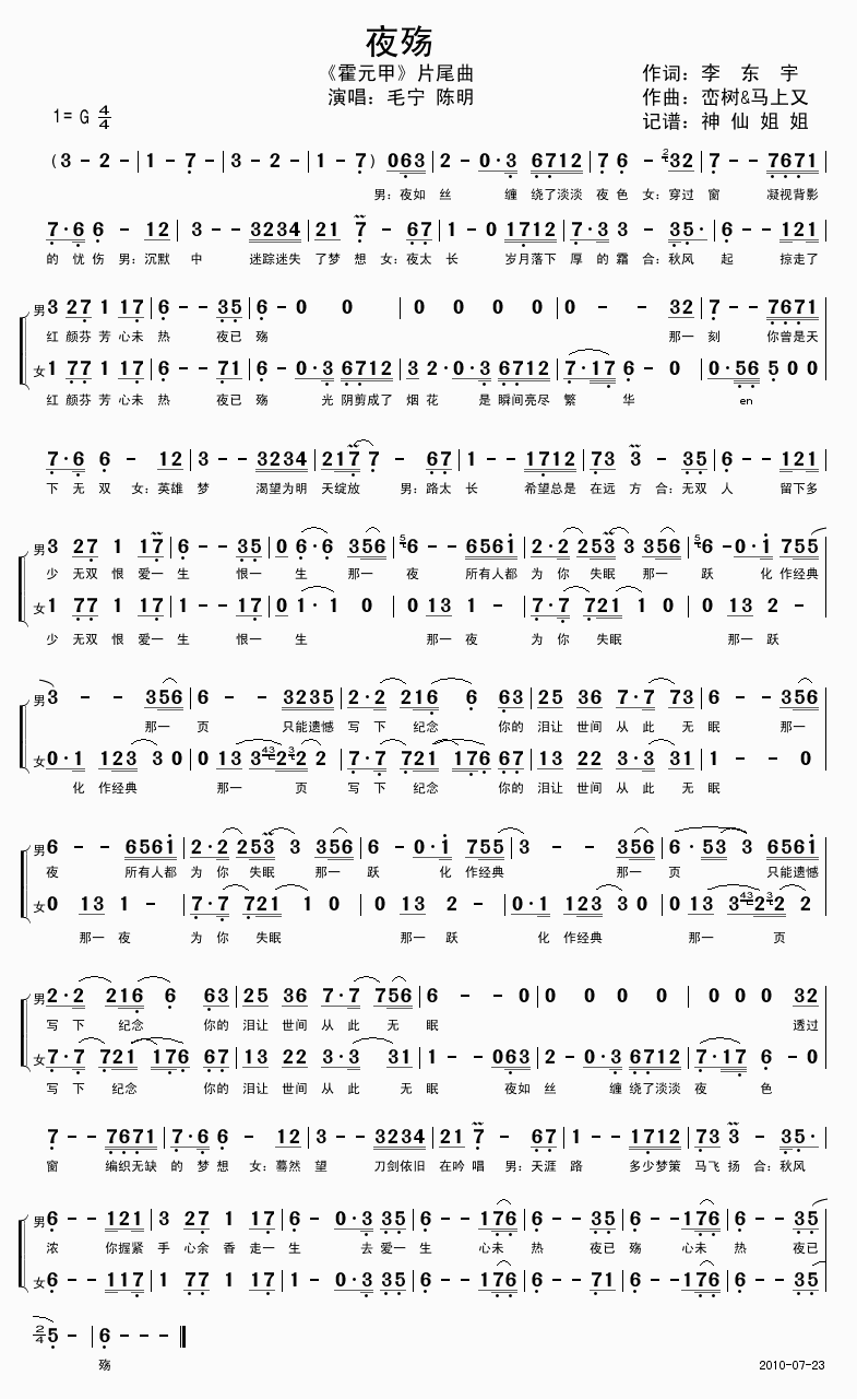 >> 夜殇-毛宁 陈明(《霍元甲》片尾曲简谱)
