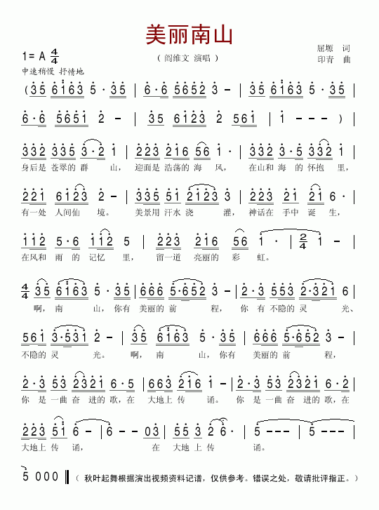 >> 美丽南山-阎维文(简谱)