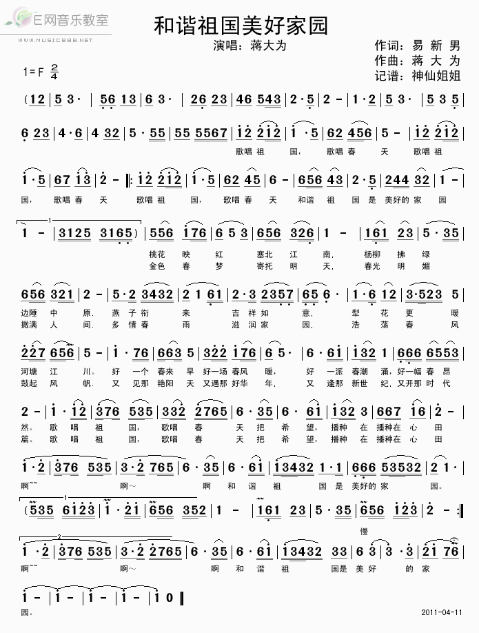 >> 和谐祖国美好家园-蒋大为(简谱)