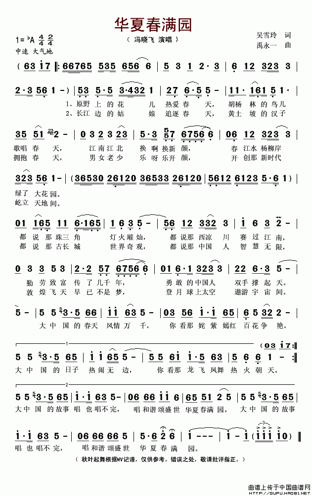 >> 华夏春满园-冯晓飞(简谱)