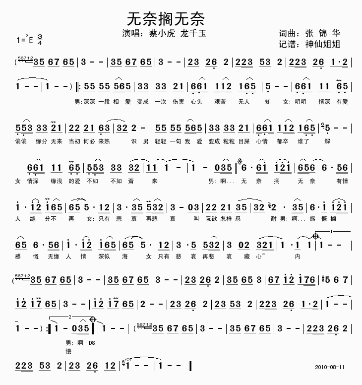 >> 无奈搁无奈-蔡小虎 龙千玉(简谱)