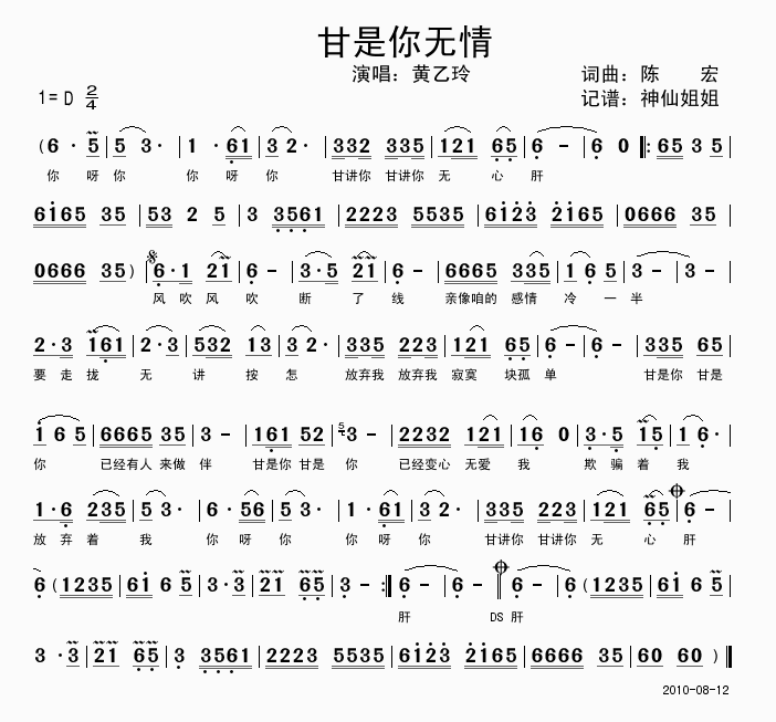 >> 甘是你无情-黄乙玲(简谱)