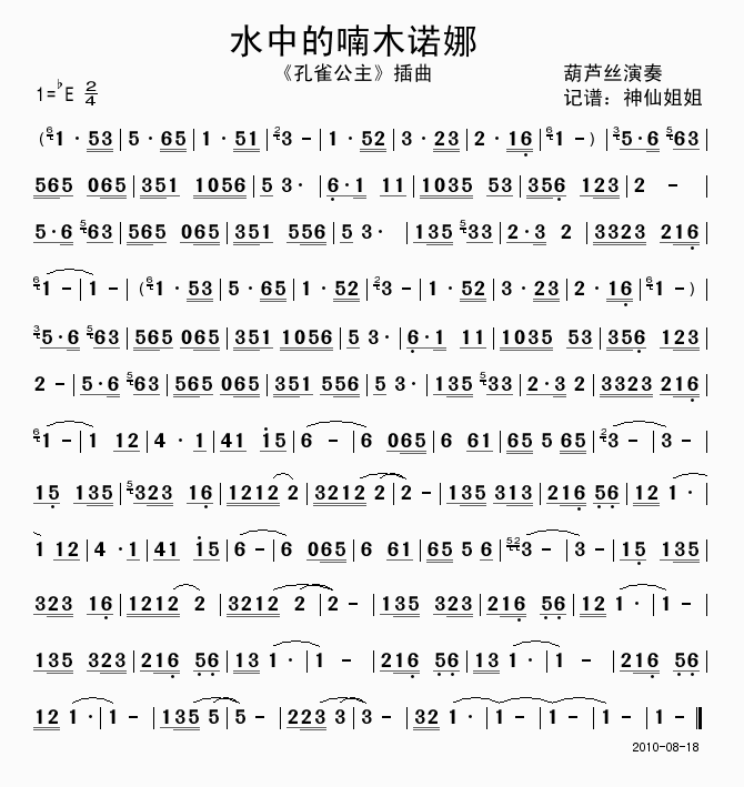 >> 水中的楠木诺娜《孔雀公主》插曲(葫芦丝简谱)