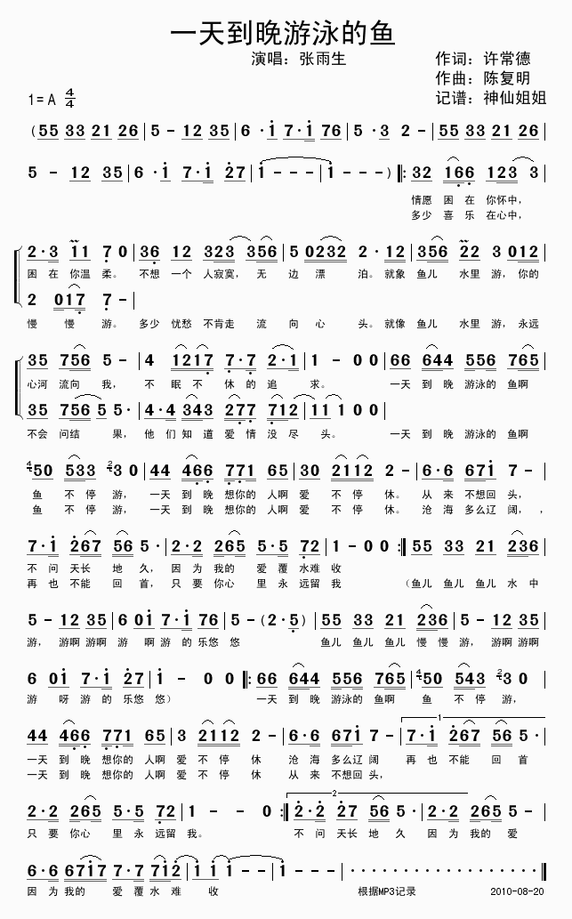 一天到晚游泳的鱼-张雨生(新谱四版简谱)