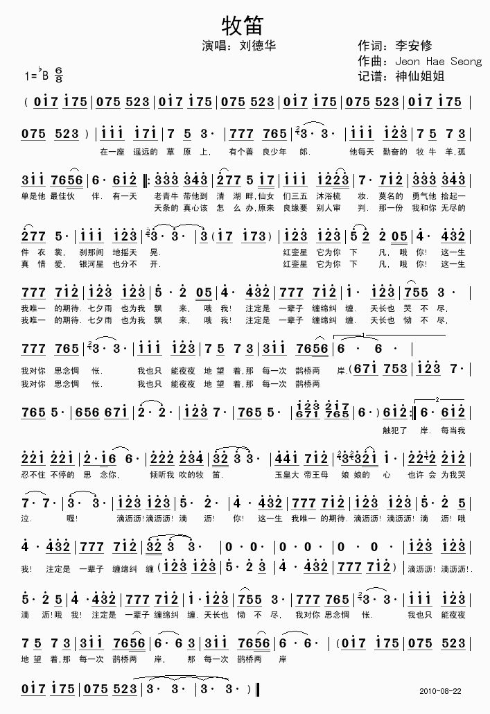 >> 牧笛-刘德华(简谱)