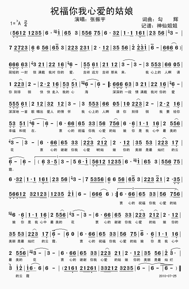 >> 祝福你我心爱的姑娘-张振宇(简谱)