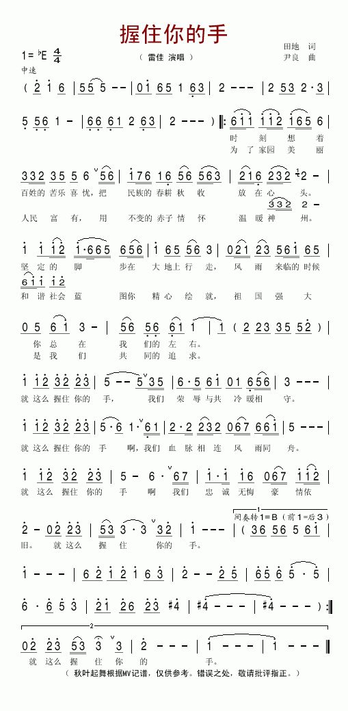 握住你的手-雷佳(简谱 歌谱 歌曲简谱 合唱简谱 民歌简谱 影视简谱)