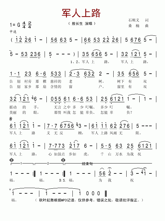 军人上路-敖长生(简谱 歌谱 歌曲简谱 合唱简谱 民歌简谱 影视简谱)