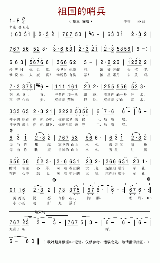 >> 祖国的哨兵-胡玉(简谱)