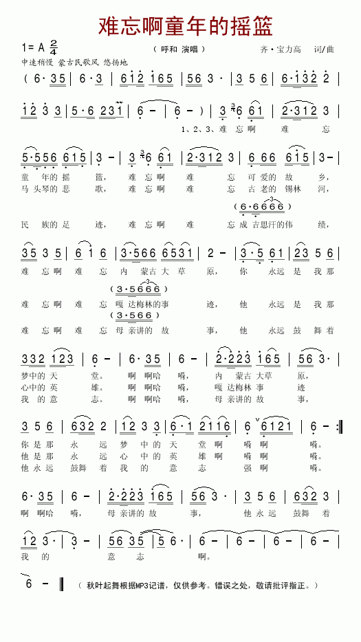 >> 难忘啊童年的摇篮-呼和(简谱)