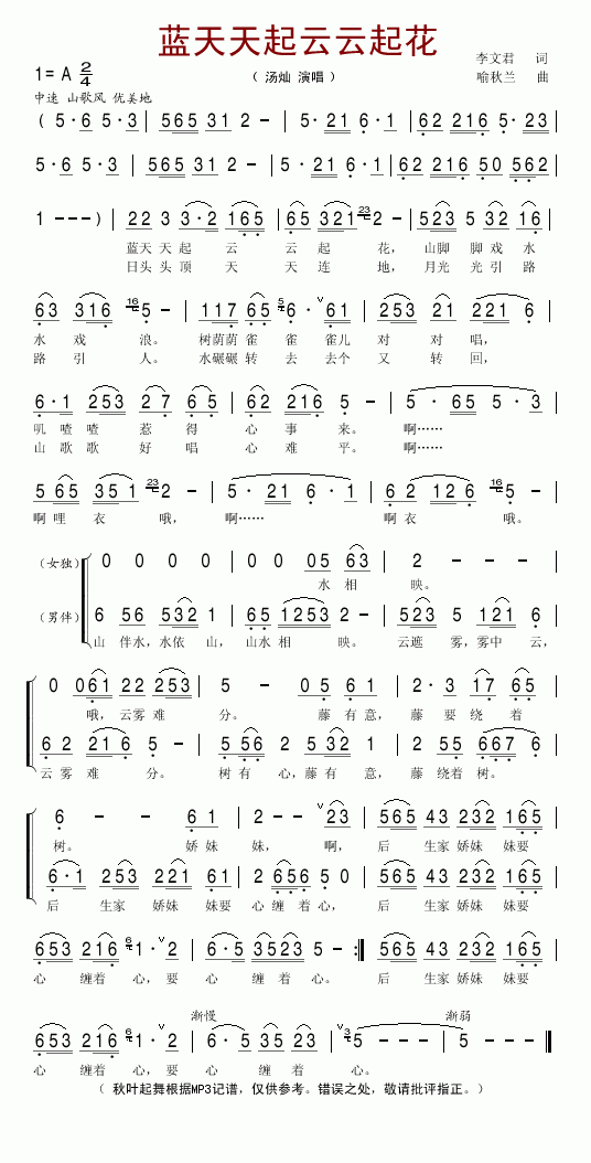 >> 蓝天天起云云起花-汤灿(简谱)