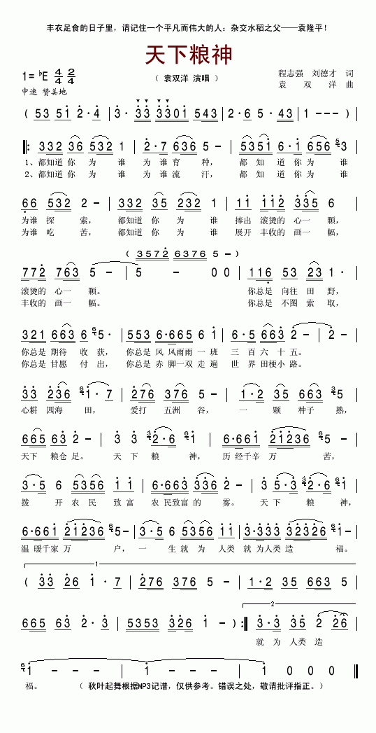 天下粮神-袁双洋(简谱)