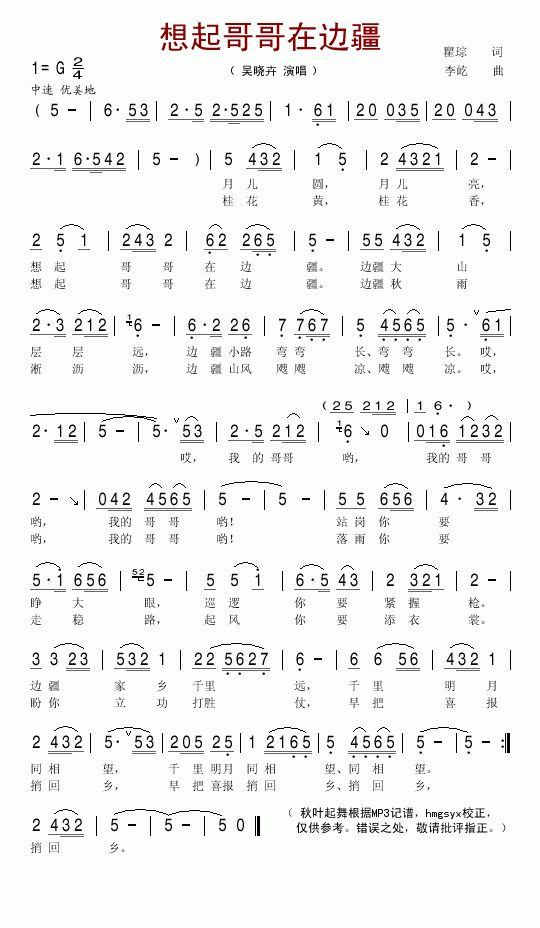 >> 想起哥哥在边疆-吴晓卉(简谱)