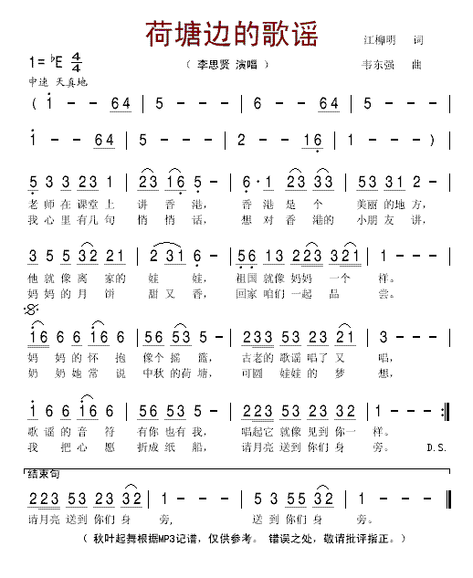 >> 荷塘边的歌谣-李思贤(简谱)