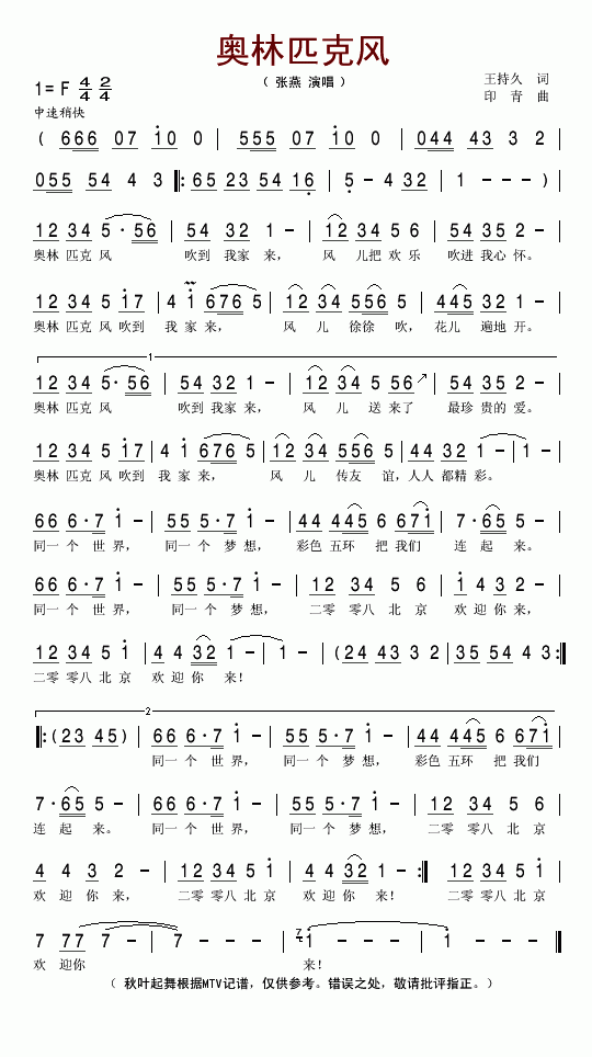 奥林匹克风-张燕(简谱)