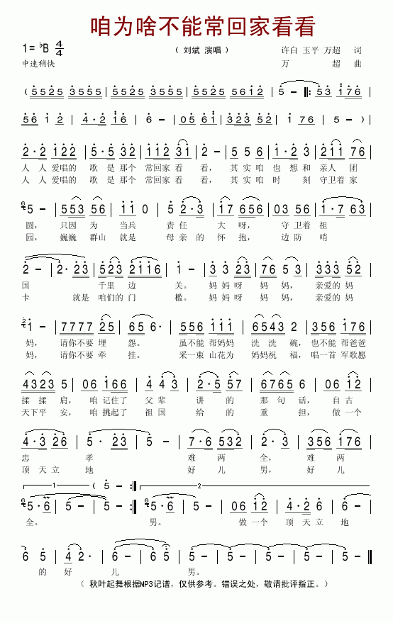 >> 咱为啥不能常回家看看-刘斌(简谱)