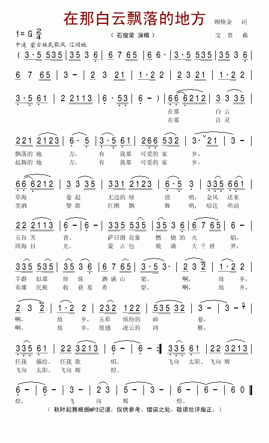 >> 在那白云飘落的地方-石俊荣(简谱)