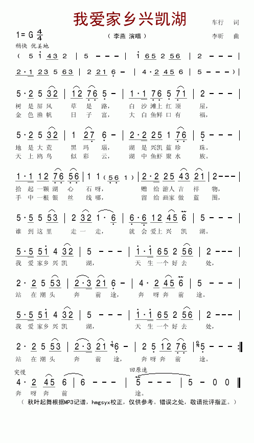 >> 我爱家乡兴凯湖-李燕(简谱)