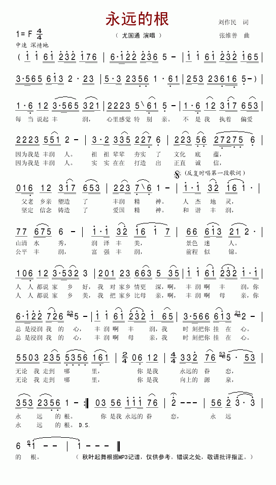 >> 永远的根-尤国通(简谱)